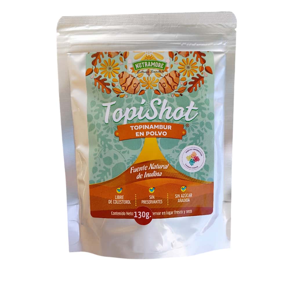 TopiShot es un alimento funcional integral elaborado a partir de topinambur 100% natural, deshidratado y molido. Su raíz es fuente vegetal rica en fibra funcional prebiótica, inulina, FOS, minerales y compuestos vegetales naturales que contribuyen a una digestión equilibrada y al bienestar intestinal.Elaborado con raíces seleccionadas y cultivadas en Chile bajo prácticas agroecológicas, TopiShot conserva sus nutrientes gracias a un proceso de deshidratado lento y temperatura controlada.